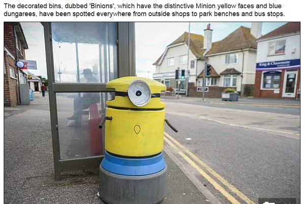 被改造過的垃圾桶擁有黃色的皮膚跟藍色吊帶褲,散佈在小鎮商店、公園、巴士站旁,由於外型與小小兵十分相像,被居民取了個「Binions(小小兵桶)」的暱稱。
